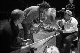 FRANCE. Ile-de-France region. Seine-Saint-Denis departement. Bobigny. MC93, 1 boulevard Lénine. "Banlieues Bleues" Jazz Festival, 20th edition. In the foreground, from left to right : US jazz musician Billy BANG (violin), Cuban jazz musician Yosvany TERRY (alto and soprano saxophones) and US jazz musician David MURRAY (tenor saxophone, clarinet bass). In the background, Cuban jazz musician Pedro MARTINEZ (percussions). Rehearsal. CONJURE. Thursday, April 3rd 2003.
