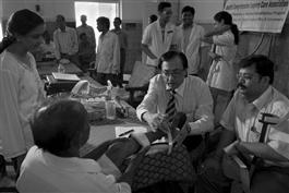 INDIA. Beroda. Ajwa Hospital. Doctor examining a patient suffering...