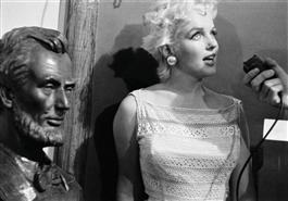 USA. Illinois. Bement. Marilyn Monroe on a publicity tour being interviewed next to a bust of Abraham Lincoln. 1955.