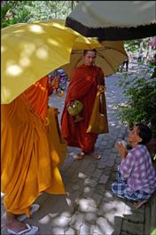 Cambodia. Phnom Penh. Wat Phnom. A woman smiles with joy while greeting three Buddhist monks, carrying umbrellas to shade themselves from the sun, and offering them some money.