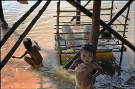 Cambodia. Siem Reap. Children swim and play in the Tonle Sap river under the stilts of their house where the piglets have their cage, also on stilts, to protect them from the rise of the water.