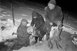 GB. England. West Yorkshire. Hebden Bridge. Many hours later, the keepers have dug down to retrieve a terrier and shot the fox. Cyanide was then placed in the lair in case other foxes are in hiding. 1975.