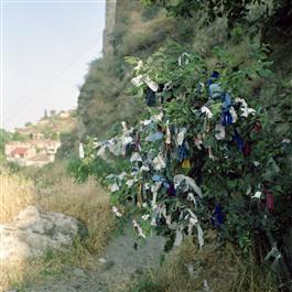 GEORGIA. Tbilisi. A wishing tree in the hills above the city where passers-by can tie a piece of cloth and make a wish. 2006.
