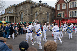 England. Salisbury. Morris dancers on St George's Day in the market square with the Guildhall on the left. 2006