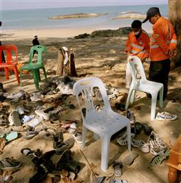 THAILAND. Khao Lak. A pile of shoes assembled by the Thai rescue services on the beach outside the Similana Resort. 2005.