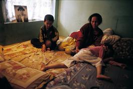 NEPAL. Katmandu. 2005. The wife and children of a Maoist student activist who was arrested by government security forces, and not been seen or heard from for several years. By 2005, Nepal has come to rival Columbia as the country in the world with the most people who have disappeared at the hands of it's security forces. The disappeared husband is seen on the photograph in the windowsill.