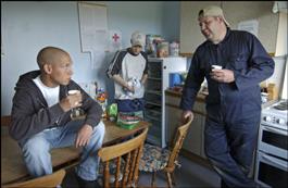 GB. SCOTLAND. Broxburn. Unemployed and previously homeless youth in their kitchen have tea with a local volunteer (right) who is helping them organise the house provided. 2005.