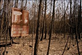Europe. Spain. Extremadura. Near Caceres. Danger of Fires sign in a fire-blackened area on the Spanish/Portuguese border. Forest fires blighted this area particularly in one of the driest years for decades.