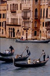Europe. Italy. Venezia. Venice. Gondoliers ferry tourists across the Grand Canal.