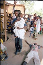 Africa. Burundi. Bujumbura. While a man suffering from malaria lies passed out on the ground, a child with drip attached is being transferred.