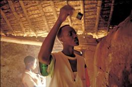 Africa. Burundi. Nr Buhiga. MSF technician checking for mosquitos by torchlight in the eaves of the roof of a villager's hut, before spraying with an insecticide.