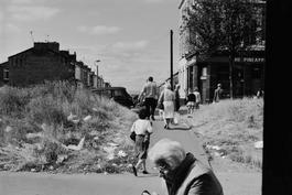 GB. ENGLAND. Liverpool. Leaving The Pioneer supermarket, Park Road, Dingle. August 1990.