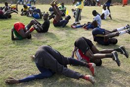 GHANA. ACCRA. 2010. Accra Hearts of Oak Premier League team. Senior team training on a borrowed college ground. Fitness training.