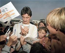 GB. England. New Brighton. Liverpool footballer Ian Rush sign's autographs. 1984.