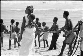 GHANA. Accra. Young mother and child looks on as local fishermen drag their in nets. 1961.