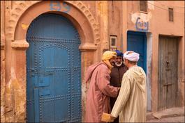 Morocco. Tiznit. Three local men in traditional Moroccan gallabiyas (hooded robes) greet each other beside an old wooden door painted blue and decorated with metal bosses inside this town walled in red mud brick. 2013