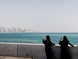 Qatar. Doha. 2013. Qatar. Doha. 2013. Women taking photos to the skyline from the Corniche.