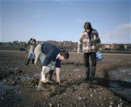 GB. Wales. N. Gower. Picking Cockles at the low tide at Penclawdd. 1985.