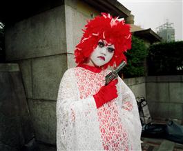 JAPAN. Tokyo. Teenage girl holding a silver gun dressed up as...