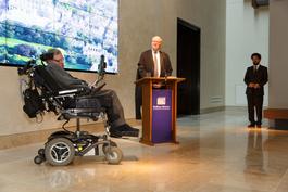 GB. England. Oxford. Stephen Hawking at the opening of Weston Library. 2015.