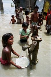 Bangladesh. Munshiganj. Shamoukbari. The Padma (Ganges) river floods this village every year and so houses for people and animals are built of bamboo and on stilts to withstand the regular inundations. Here young girls get pure water from the pump but allow the heavy bowl to sink into the flood water thus contaminating the fresh supply.