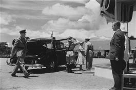 UGANDA. Jinja. Queen Elizabeth II, Queen of England. On her second day in Uganda, the Queen and Prince Philip flew to Jinja, then drove to the parade ground of the 4th Kings African Rifles. Here the presentation of Colours to the 4th Uganda Battallion, Kings African Rifles takes place. 1954.
