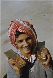 KUWAIT. The Oil Industy. A young Kuwaiti messenger boy carrying 25 punds of Gold on his shoulders. 1952.