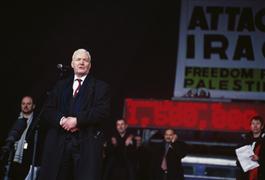 G.B. ENGLAND. London. Hyde Park. MP Tony Benn speaks to anti-war protesters. The number of marchers was estimated between 750,000 to 2,000,000. 15 February 2003.