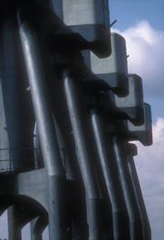 G.B. ENGLAND. London. The regeneration of the London Docklands. The Royal Docks, the largest docks ever built by Man, are the next area to be developed. On the edge of the Enterprise zone, this will contain a STOL airport, which opens later in 1987. Closed less than five years ago the docks are reminiscent of an era gone by, trade and ships long since gone to the deeper water up river. Closed due to restrictive practices by the dockers, but also due to changing nature of the work caused by containerisation, all that are left are empty warehouses and abandoned cranes, creating a very spooly atmosphere. 1987.