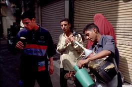 Africa. Egypt. Cairo. A customer blows the froth off a glass of a non-alchoholic beverage bought from a seller in the souk.