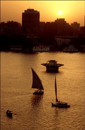 Africa. Egypt. Cairo. A view from the Sheraton hotel of traditional shipping on the river Nile.