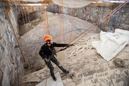 FRANCE. Paris. 30 September 2022. Notre-Dame de Paris. The cathedral's restoration. Rope climbers above the vaults of the heart.