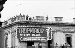 CUBA. La Havana. 1959. Bystanders on the roof of a building and balcony of a nightclub watch as rallies begin to form in the streets.