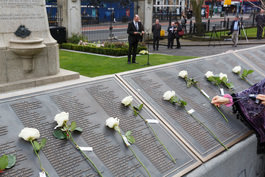 GB. Northern Ireland. Belfast. Town Hall. Titanic Memorial Ceremony. A rose is laid from a relative or freind of the dead. 2015.