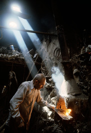 IRAN. Qom. Summer 1979. Light filters through the roof of the bazaar on the workshop of a blacksmith.