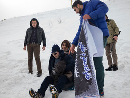 IRAN. Dizin. 2016. At a playground at Iran's biggest skiing resort, Dizin, Iranians from across the country enjoy the snow up in the Alborz mountain range. Those who don't know how to ski or can't afford the $27 dollars admission ride tubes or participate in snowman building competitions.