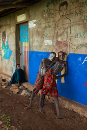 ETHIOPIA. Omo Valley, 2013. Two boys stand next to a painted wall.