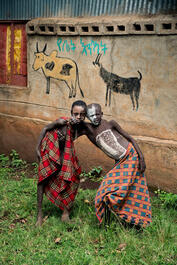 ETHIOPIA. Suri Tribe, Omo Vallery. 2013. Two boys lean on eachother.