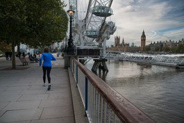 UNITED_KINGDOM. South Bank Tower, London, 2013. A woman runs along Westminster Bridge Road in London.