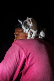 India. 2015. Kashmiri Carpet seller and his cat, Kovalam.