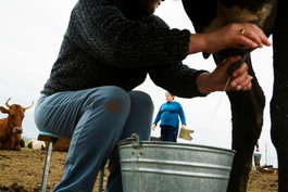 UKRAINE. Serebrianka, Crimea. 2006. Milking cows on an old collective farm that Tatars and ethnic Russians share. Crimean Tatars, a Turkic group of Sunni Muslims, have returned to their homeland since the fall of the Soviet Union. Their families had been deported to Uzbekistan by Stalin, who wrongfully accused them of collaborating with the Nazis.