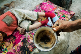 TAJIKISTAN. Nisur. 2008. A young boy's grandmother brings fresh water from a mountain stream to clean the boy's hands before dinner.