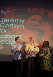 GB. England. London. 2015. Labour leadership rally at the Camden Centre in support of Jeremy Corbyn. Left to right: Owen Jones, Jeremy Corbyn, Martha Osamor.