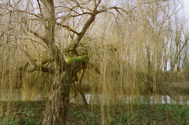 GB. Oxford. 2016. Footpaths where people walk around the university. Approaching university parks. Willow tree.