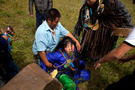 MONGOLIA. Ulaanbaatar/Dogan Had. 2010. Professional shamans from Ulaan Bataar bring their students to the countryside to speak with their ancestor spirits for the first time. They set up gers inside a sacred area whose perimeter they marked with string and begin the long series of rituals and sacrifices that will last the whole weekend. The new shamans enter a trance and begin to speak with their ancestor spirits for the first time, with family members giving support. Families have long been detached from their ancestors because shamanism was suppressed for so long, so the process of reconnecting is trying.