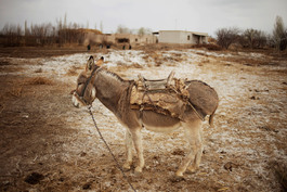 TURKMENISTAN. Dashogus Region. 2009. A donkey is chained near its owner's property, grazing on salty land. Overfarming across the region and the excessive use of pesticides has made the land toxically salty.