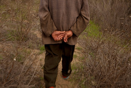 TURKMENISTAN. Kerki. 2009. A beekeeper walks through his camp site near the Karakum Canal. This land was parched desert until the canal was built. Now all kinds of insects and plants grow here.