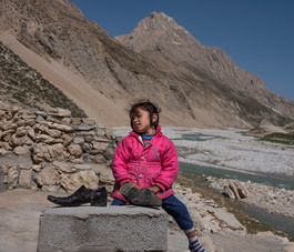 IRAN. Zardkuh, Chaharmahal and Bakhtiari. 2018. Mojgan Alimardani, 3 years old waiting for her mother and aunt to bring their equipments and stuff to the other side of a river close to Chama- Ghaar Yakhi (Ice Cave) which is is their tent’s place for the next 6 months. Mojgan is engaged to a boy in her age from their tribe. She used to wear an engagement ring, which her mother took of from her finger during their moving to prevent her losing it. Engagement in this age called “Putting name on the girl, which means she is willing to marry the boy.”