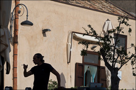 Europe. Italy. Sicily. Scopello. Evening in the square of this small town in the hills above the rocky coastline on the north coast of the island, with the waiter at the small cafe silhouetted against the wall by the sun setting behind the mountain. 2018