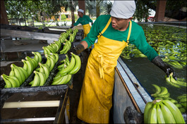 Workers place the hands of bananas into the tub for washing and bagging at the Fairtrade Bananera de Uraba.